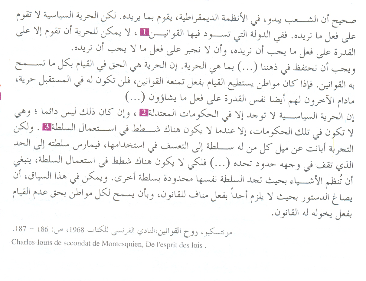 الأولى تمسي الحرية خاضعة للقانون. هذا الأخير الذي يضمن الحرية للأفراد من
